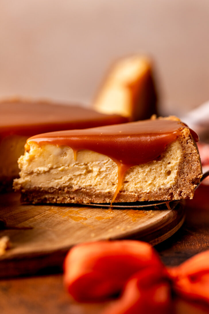 This caramel cheesecake is the ultimate salted caramel cheesecake! It has a graham cracker crust, baked ultra creamy cheesecake, and extra homemade caramel on top!