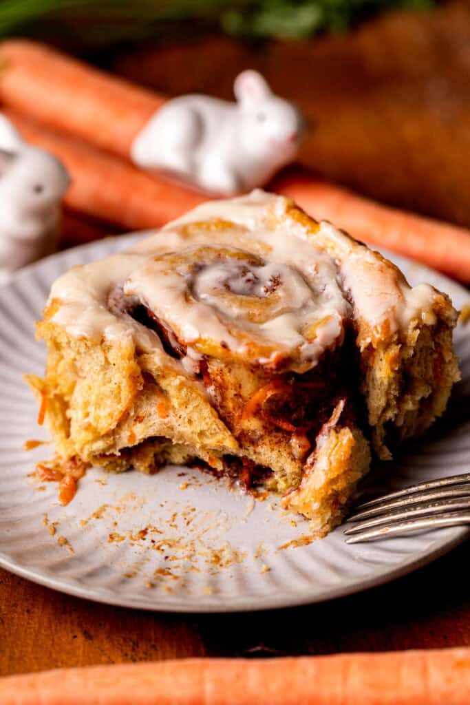 These carrot cake cinnamon rolls are perfect for Easter or spring! The dough is full of carrot and spices. It is filled with cinnamon filling, carrots, and a honey drizzle. Topped with cream cheese icing.