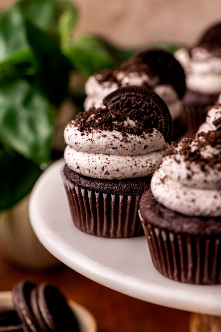 These Oreo cupcakes are super soft chocolate cupcakes topped with Oreo whipped cream cheese. It taste like Oreo mousse on top of a cupcake!