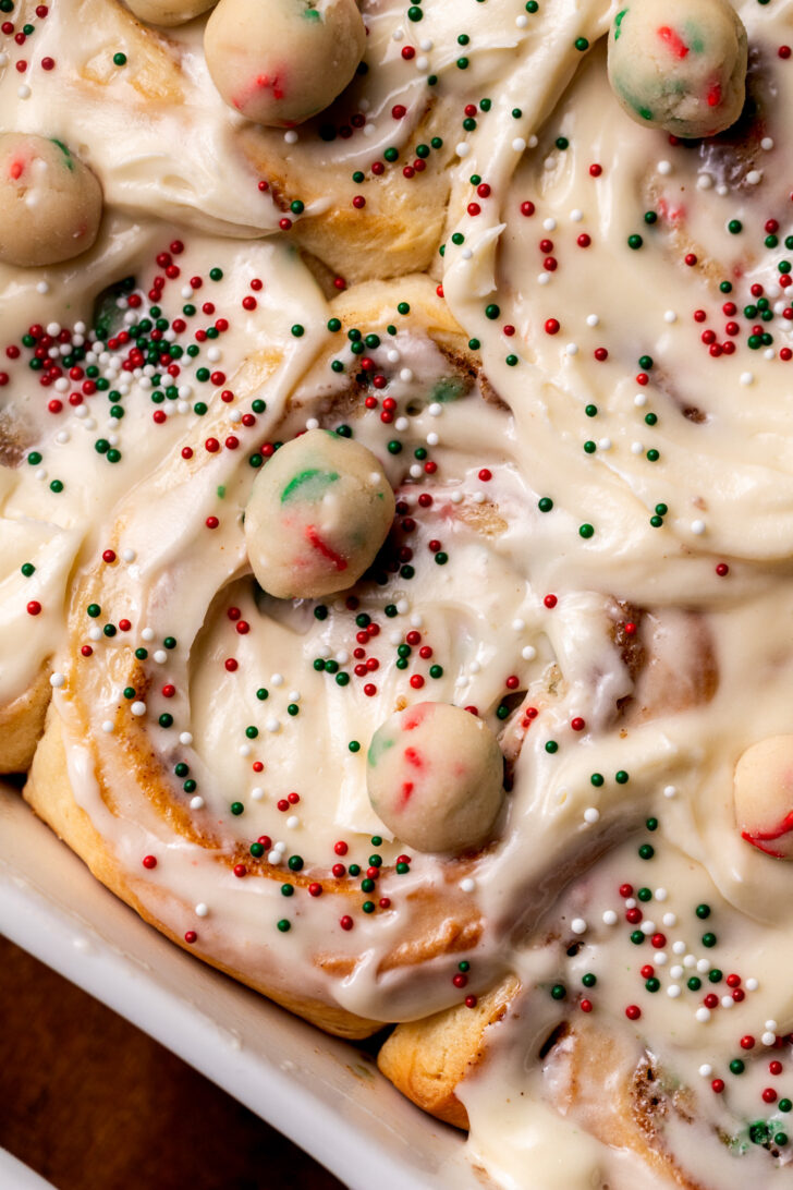 - Once the rolls are no longer bubbling, use a spoon to dollop the icing on and spread. I topped with extra cookie dough balls and Christmas nonpareil sprinkles.