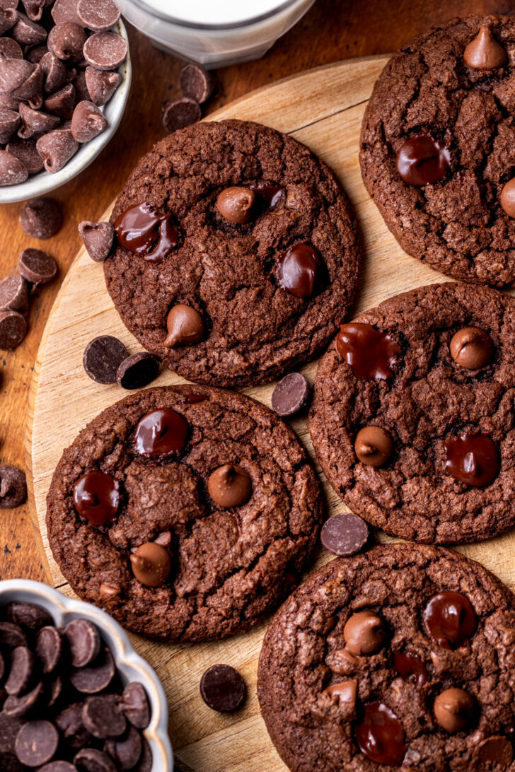 These triple chocolate cookies are full of chocolate! They have melted chocolate, cocoa powder, dark chocolate chips, and milk chocolate chips in the cookie dough!